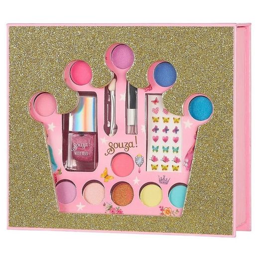 Caja maquillaje con forma de corona Souza con sombras de ojos, esmalte de uñas, pegatins y pinceles. Pintauñas pensada paraniños y niñas con materiales formulados con base de agua y sin componentes toxicos. Contiene: 11 sombras de ojos y pincel, hoja con 24 adhesivos para uñas, 1 aplicador suave con esponjas y un esmalte para uñas. Composición: Esmalte con base de agua, fórmula sin disolventes, sin ftalatos, sin tolueno, sin bisfenol y sin perfume. Dermatológicamente testado. A partir de 3 años. No testado en animales. Souza es una marca que trabaja en los Países Bajos en la creación de accesorios infantiles y ropa de disfraces que llevará a los peques a sus mundos de fantasía e imaginación.