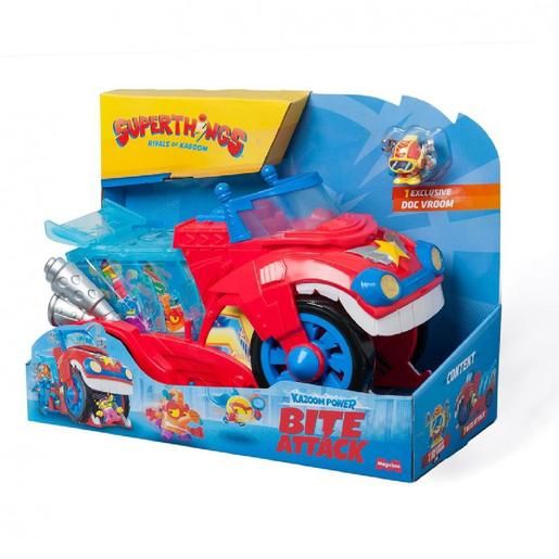 Este innovador vehículo cuenta con una función de mordida que se activa al moverse, permitiendo capturar a los villanos de manera dinámica y divertida. Además, incluye una figura exclusiva de Doc Vroom, añadiendo un valor especial para los coleccionistas. Una de las características destacadas del Bite Attack es su cárcel portátil extraíble. Al presionar un botón, la cárcel es expulsada, pero los jugadores deben tener cuidado, ya que la puerta puede abrirse y liberar a los enemigos capturados, añadiendo un elemento de sorpresa y estrategia al juego. Este diseño interactivo fomenta la imaginación y creatividad de los niños, permitiéndoles recrear emocionantes aventuras en el mundo de Kaboom City. El Bite Attack es lo suficientemente grande para ofrecer una experiencia de juego envolvente, pero lo suficientemente compacto para ser manejado fácilmente por los niños. Este producto cumple con los más altos estándares de calidad y seguridad, asegurando una experiencia de juego segura y duradera. Un juguete imprescindible para los fans de SuperThings, ofreciendo horas de entretenimiento y fomentando el desarrollo de habilidades narrativas y motoras en los niños.